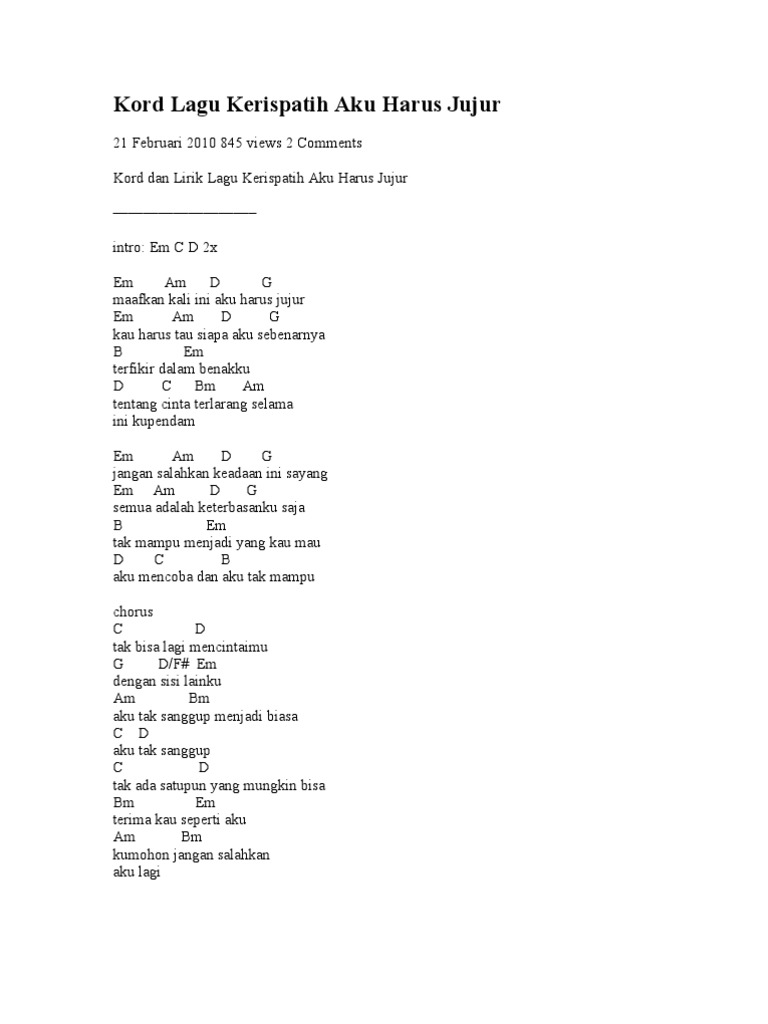Lirik Lagu Kunci Chord Gitar dan Lirik Lagu Aku Harus Jujur Kerispatih Maafkan Kali Ini Aku Harus Jujur Lagu Harus Jujur Kerispatih dirilis pada 2009 lalu dan diciptakan oleh sang keyboardist Badai. Kerispatih Aku Harus Jujur Lirik Maafkan kali ini aku harus jujur kau harus tau siapa aku sebenarnya terfikir dalam ingatku tentang cinta terlarang selama ini ku pendam jangan salahkan keadaan ini sayang semua adalah keterbatasan ku saja tak mampu menjadi yang kau mau aku mencoba dan aku tak mampu tak bisa lagi mencintaimu dengan sisi. Chord Kerispatih Aku harus jujur - intro Em C D 2x Em Am D G maafkan kali ini aku harus jujur Em Am D G kau harus tau siapa aku sebenarnya B Em terfikir dalam benakku D C Bm Am tentang cinta terlarang selama ini kupendam Em Am D G jangan salahkan keadaan ini sayang Em Am D G semua adalah keterbasanku saja B Em tak mampu menjadi yang kau mau D C B aku mencoba dan aku tak.