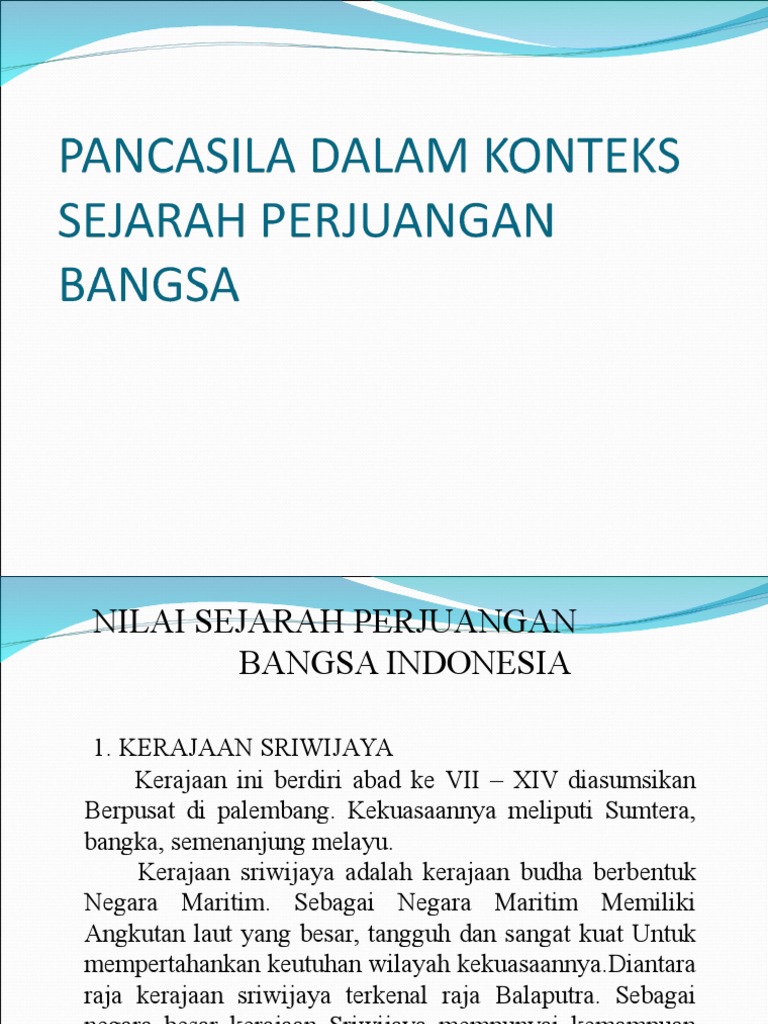 Bersama dengan itu berkembang pulalah Kerajaan-kerajaan Islam seperti kerajaan Demak dan mulailah berdatangan orang- orang eropa di nusantara antara. Sejarah Perjuangan Bangsa Indonesia Pancasila yang disahkan oleh PPKI pada tanggal 18 Agustus 1945 merupakan dasar filsafat negara Republik Indonesia menurut M. PANCASILA DALAM KONTEKS SEJARAH PERJUANGAN BANGSA INDONESIA na sta jaya tas a 0.